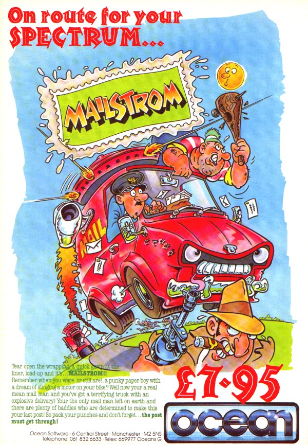 Issue 14 (Feb 1987) (Your Sinclair) 6th Nov 2015 02:32Mailstrom is a post punk Postmen Pat. In the true spirit of Wells Fargo, your task in this icon driven adventure is to make sure the mail gets through. Thing is, the hazards you face are a shade more formidable than a yapping Yorkie or a missing postcode. For this is post North Sea oil Britain, run by criminals out to do their darndest to marmalise your mail van.