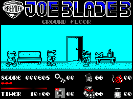 | Publisher: Genre: Author(s): Minimum Memory Required: Maximum Players: Joysticks: Language: Media Code: Media Type: Country of Release: Related Titles: Comments: | Players Premier SoftwareArcade Tom Prosser, Sonic Graffiti, Andrew Severn 48K 1 Kempston, Interface 2 Eng N/A Audio cassette Europe Joe Blade Joe Blade 2 | Click to choose platform: Amstrad CPC Sinclair ZX Spectrum |