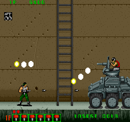 The basic weapon is of course the machine gun. It's pretty weak, but thankfully, you can accumulate quite a few other weapons throughout the game. That includes a spread shot weapon (just like Contra's), a flame thrower (also like Contra's), and powerful fusion bomb (I'll cut a little slack on this since it didn't come until Contra 3 a couple of years later).