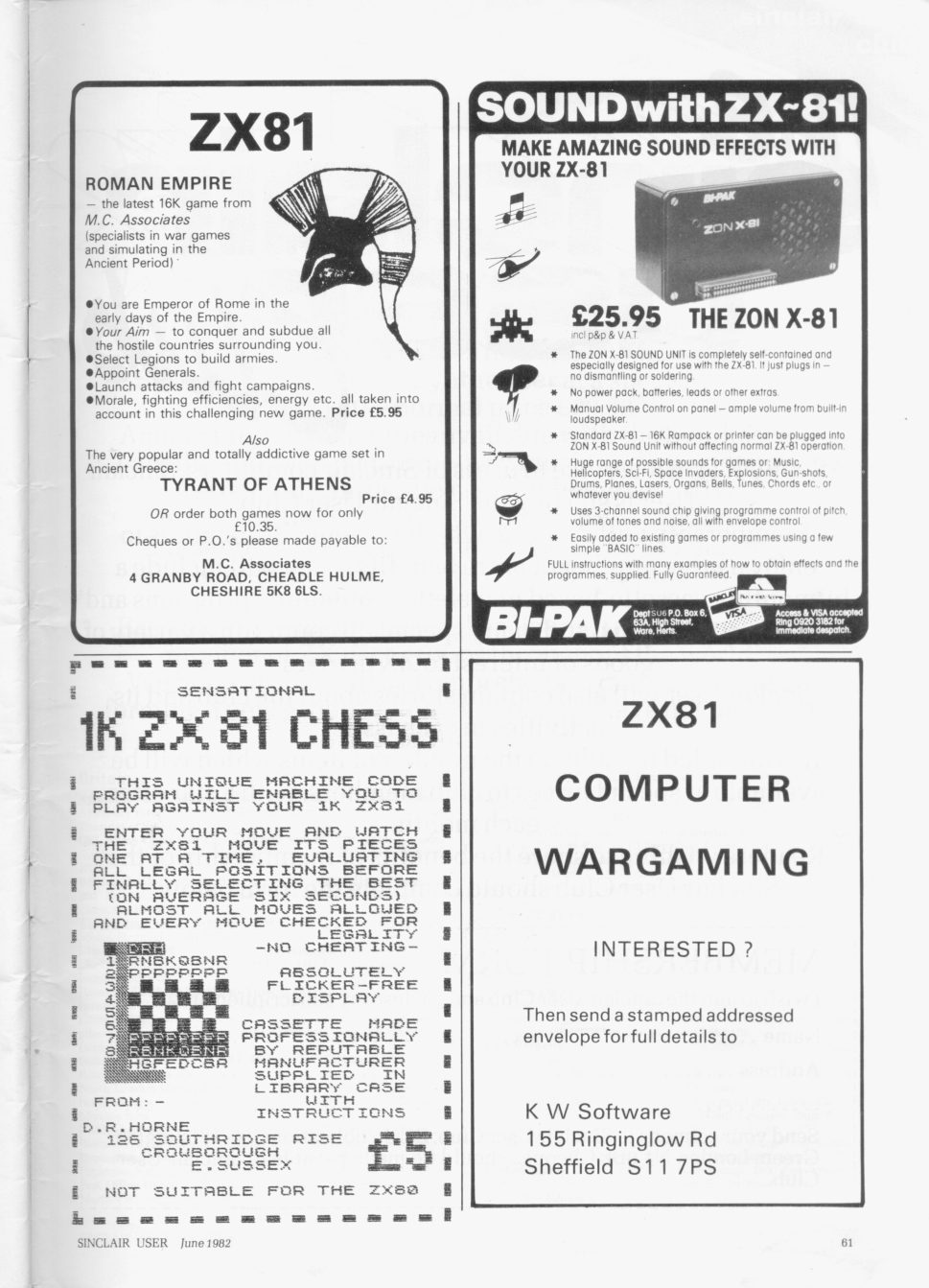 | Publisher: Genre: Author(s): Minimum Memory Required: Maximum Players: Joysticks: Language: Media Code: Media Type: Country of Release: Other Files: Comments: | MC Lothlorien Ltd Strategy Mike Cohen, Roger Lees, Geoff Street 16K 1 - Eng N/A Audio cassette UK (£5.95) Advertisement | Click to choose platform: Acorn BBC Acorn Electron Sinclair ZX81 Sinclair ZX Spectrum |