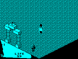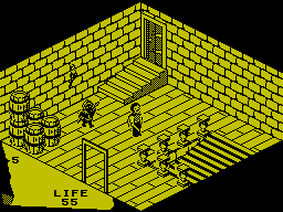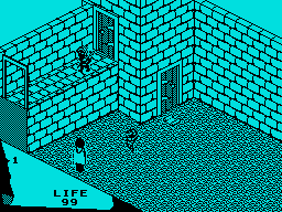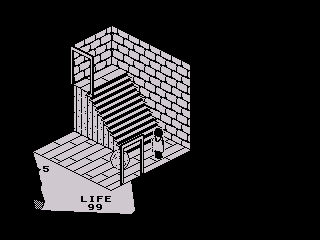 Isvar begins with a life force of 99 units, shown on a counter on the scroll. This counter is decremented by encounters with the trolls, guards and other nasties that patrol the castle and may be topped up by eating food or drinking wine that can be found here and there. Isvar can fight and kill some of the nasties, using his sword, but other opponents are not in the least perturbed by his efforts and are best avoided completely.