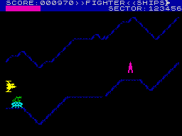 It’s a quite classic version with caves, missiles, city, fuel dumps (for fuel and points), defence installation, asteroids and alien fighters. Once a sector is completed, it means that on loss of life you start at the beginning of the sector. The object of course, is to penetrate as deep as you can into the caverns (of Zragg in this case) and destroy the Dictator’s lair (and save Watford — for what?) whilst avoiding the automatic missiles and guardians, and without crashing into the zig-zagging walls and ceiling at a reckless speed.