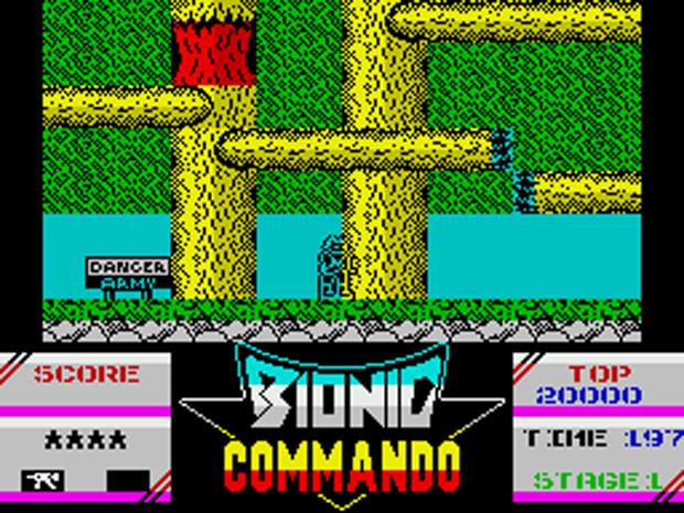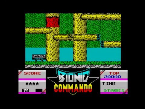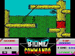 The mission takes place over five levels of four-way scrolling terrain. Each stage is timed and must be completed within 200 units. The environment, which ranges from the jungle, via a fort, a complex of pipes and control tower, to the missile centre itself, consists of a network of platforms patrolled by a host of vigilant enemy soldiers. The player parachutes into the forest and attempts to make his way up, along and across these platforms using his bionic arm - a telescopic extension with a grappling hook at the end. This clips on to nearby branches and enables the intrepid commando to swing gracefully from tree to tree.