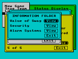 ZXGoldenYears.net (Unknown) 8th Mar 2011 12:11I've heard this game described as being like Rainbow Six for the Spectrum, with thieves instead of special forces, and this is actually quite an apt comparison. You begin by recruiting a team of criminals with which a undertake a series of daring robberies. Each criminal possesses different skills, so it is important to ensure that your team is properly balanced. Once your squad of ne'erdowells has been assembled, you move onto the next section of the game, which deals with the raid itself. You oversee the operation, issuing orders to the team members and staying in touch with developments via walkie-talkie, as they break-in and snatch the swag. This is excellent game - involving, intelligent and highly original. Stick with it and maybe you'll achieve the coveted status of Public Enemy Number One.