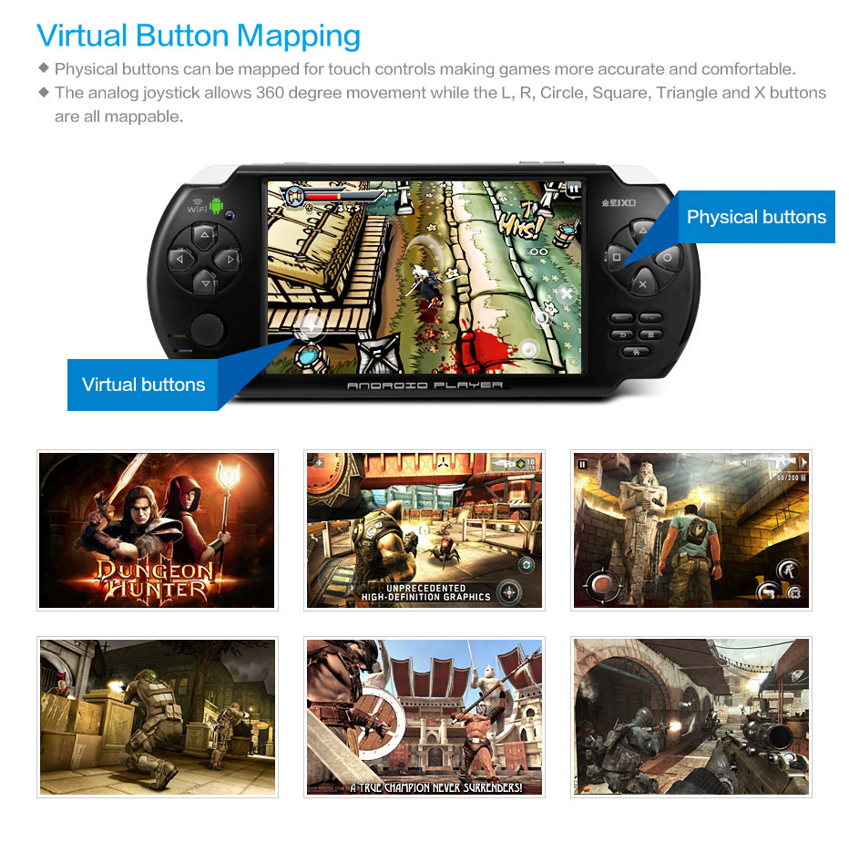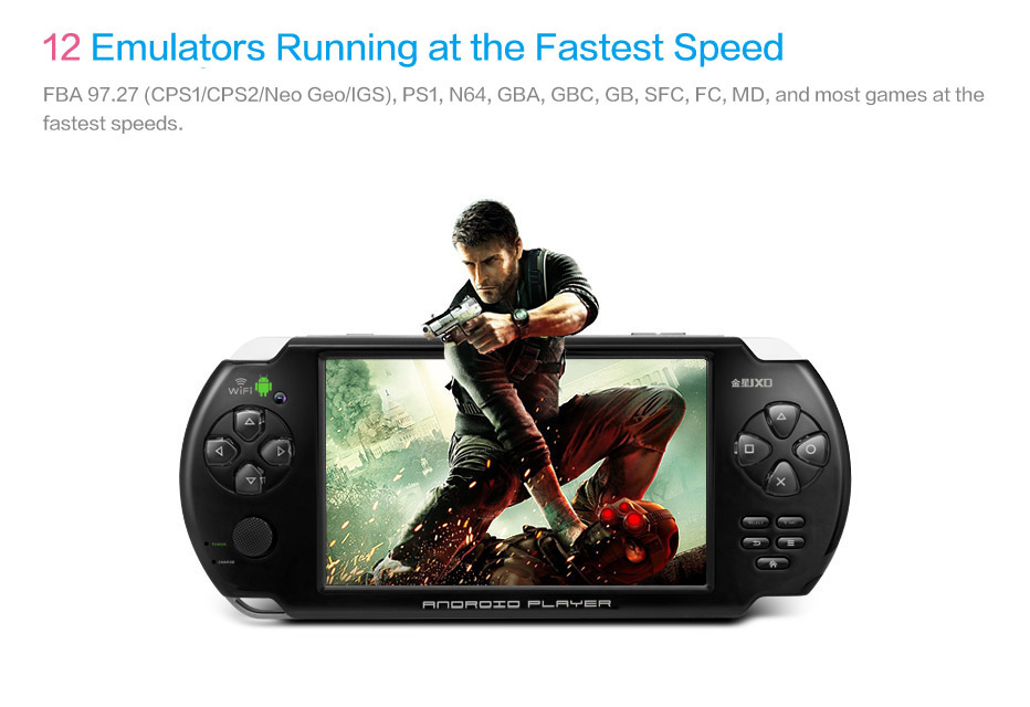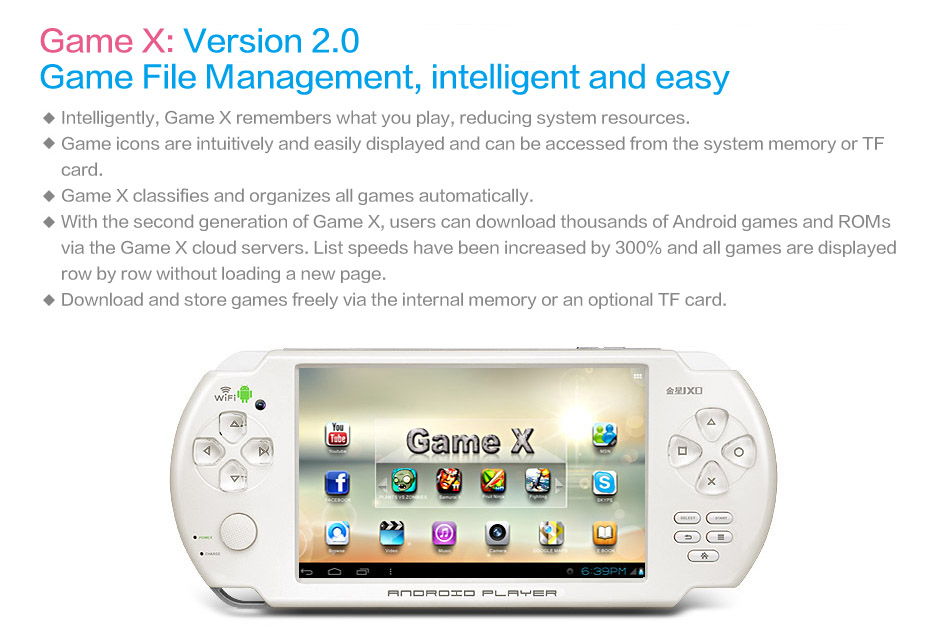 | Games Supported | 12 preloaded emulators (FBA 97.27 (CPS1/CPS2/Neo Geo/IGS), PS1, N64, GBA, GBC, GB, SFC, FC, MD, etc.) Game X: Version 2.0 | |