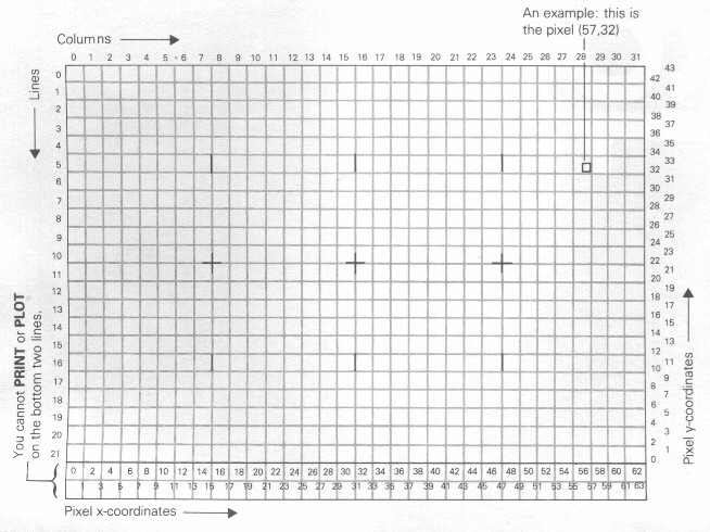 | PLOT m,n | Blacks in the pixel ( | m | , | n | ); moves the PRINT position to just after that pixel.