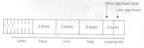 | FOR α=x TO y STEP z | Deletes any simple variable α, & sets up a control variable with value x, limit y, step z, & looping address 1 more than the line number of the FOR statement (-1 if it is a command). Checks if the initial value is greater (if step See NEXT α. Error 4 occurs if there is no room for the control variable. |