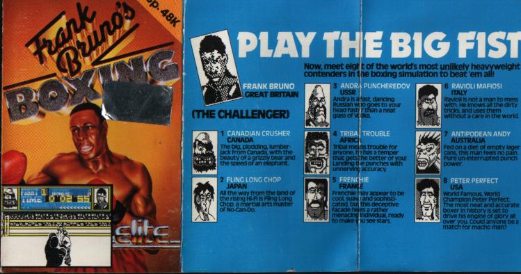 ![]() | Frank Brunos Boxing Publisher: Elite Systems Ltd Released: 1985 Platform: Commodore 64 |