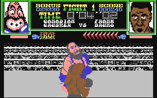 The view of the ring is from slightly above and behind your boxer, none other than Frank Bruno, so you're looking into the screen with the opponent facing. As a digitised Frank, one can perform several manoeuvres, such as left and right head punches, body blows, a Knock Out punch, ducking, and of course guard up and down. Using these skills the other fighter has to be knocked down a total of three times within the given time limit.