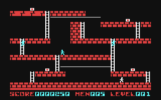 The sprites used are nothing more than stick men, about a character square high. But they are in fact well animated. Bricks, blocks, ladders, and bars, are all as simple as the sprites. Even the colour scheme is plain, consisting of a mere four colours.