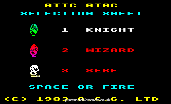 | Publisher: Genre: Author(s): Minimum Memory Required: Maximum Players: Joysticks: Language: Media Code: Media Type: Country of Release: Other Files: Comments: | Ultimate Play the GameAction Ultimate Play the Game, David Rhys Jones 32K 1 Yes Eng N/A Audio cassette UK Atic Atac map, Official game poster | Click to choose platform: Acorn BBC Sinclair ZX Spectrum |