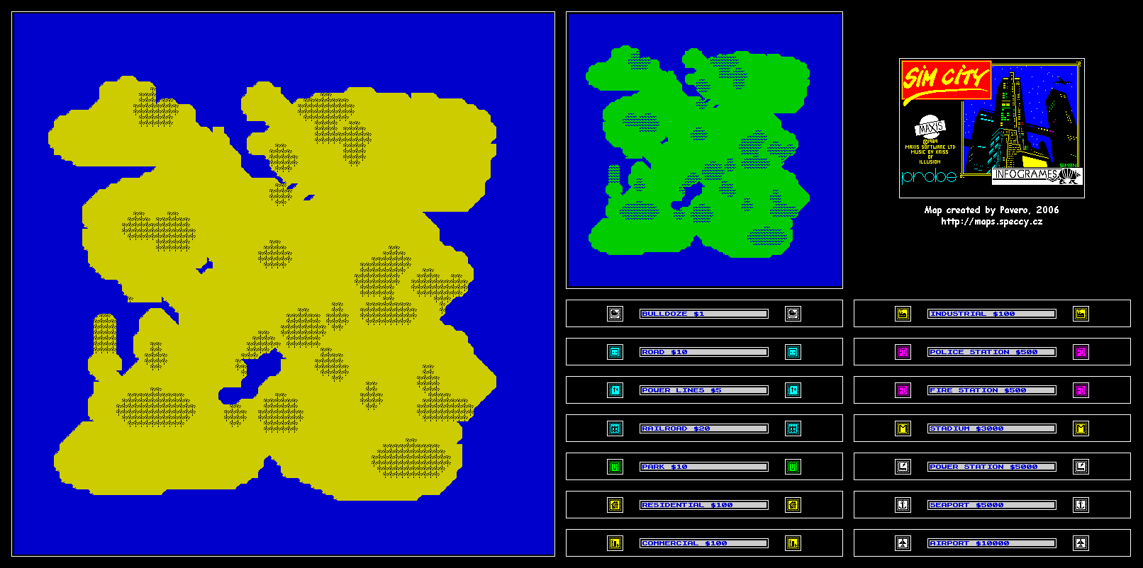The other nice thing - and this is a compliment to the boys at Probe - is to see a brilliant but very complicated concept like this being so well executed on the Speccy. It's incredible. Except for the loss of a few nifty little features from the original 16-bit versions (like a mini-Godzilla which you can allow to run loose in your city while you try and patch up the damage) the game plays just perfectly - it's one of those things where the loss of brilliant graphics really makes no difference whatsoever to the fun you can get out of playing the game. It's full of neat little touches too - build a train track and, lo and behold, a little choo-choo is trudging along it back and forth, back and forth. (You need to look closely to see it, but it's there.) Bung down a commercial area (marked 'C' - industrial ones are marked 'I', and so on) and it'll start off as a big grey block, but watch it over time and gradually little buildings will develop on it and grow, though the identifying letter will remain intact. Wait long enough and you'll eventually get a New York-ish skyline (though I've always gone bust by then).