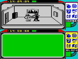 If you are playing against the computer, you can reset its 'intelligence' at the start of each game. A rating of five for the computer means the black spy is going to be pretty smart and probably set a lot of traps - on IQ one you are dealing with a dumb thug. And the environment in which the game is played can also be changed at the start of each game. The size of the building can be pre-set, with the smallest having only six rooms while the largest has thirty six rooms and a lot of hidden passageways to boot. Points are scored for giving the other spy a hard time, e.g. killing him. How many points rather depends on how you did it. Points are deducted for using the map as well as for being a victim. If you do get killed, though, you are going to lose a great deal more than a few points. First, unless the other spy is a real gorilla, you will lose the articles you have gathered and secondly you will lose time - that's very precious because the plane only waits for so long. You can still lose the game, even as you make for the exit, if the plane leaves without you.