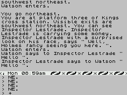 Thus early in 1983 Philip Mitchell, now elevated to Melbourne House’s lead adventure developer in the wake of Veronika Megler’s departure, started work on Sherlock, building upon the adventure engine he and Megler had developed for The Hobbit. The core idea remained the same: to create a living world populated by other characters going about their business and pursuing their own goals, full of dynamism and emergent elements. Throw in the complications of an intricate mystery plot rather than a simple quest narrative, and it became one hell of a tall order. Throw in the need to have it all reside, with graphics, in 48 K of memory, and it started to look impossible. Confidently expected at first in a matter of a handful of months, the release date was pushed back to February of 1984, then to perhaps May or June, finally to September, while Mitchell wrestled with the challenge in two-steps-forward-one-step-back fashion (or sometimes vice versa). The game finally appeared after some eighteen months of development, a crazily long amount of time to work full time on an adventure game by the standards of the early 1980s; Level 9’s Pete Austin, by way of comparison, cranked out four big adventures in the same period while also helping to run a company. Sherlock‘s belated arrival was greeted as a major event. It simply had to be something special.