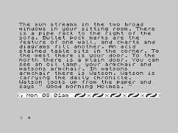 And that it certainly was — albeit perhaps not quite in the way anticipated. Sherlock starts with all the weirdness of The Hobbit and then multiplies it by ten. The game seems to have a life of its own, to have gotten away not only from you but also from Mitchell. To play is to step into a bizarrely addled world where nothing quite works the way it ought to. It starts with the opening text, which reads like it was written by a Victorian difference engine with a poor grasp of English grammar.