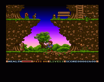 There are eight levels of forest, ruins, swamps to wade through before reaching the Castle of Necrilous, where Elisa is being held. It is at this grim fortress that you must locate and destroy the winching mechanisms used to lower innocent victims to their deaths. On your journey, you will find many useful objects scattered about the landscape. Collecting herbs and pets will allow you to purchase pieces of equipment from the shops that are secreted throughout the game. Valuable commodities include power-ups, three-way fire, a magic force field and a flying machine. It's also possible to buy inane hints. These include gems as 'Never eat pickles if you want to keep friends' and other such banalities.