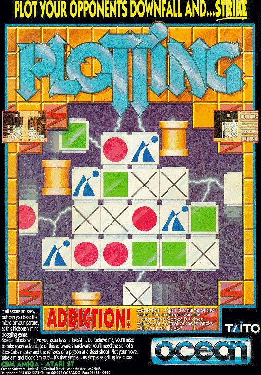 Plotting - it's simple, but it's dead hard! What a rummy game this is, and a strange fish from Ocean; y'see it's an arcade puzzle game. With the objective of clearing each level of a set number of tiles, Plotting's gameplay can be easily learned, but it'll take hours of play to master. Well presented, graphics are clear and colourful, make it look and feel more exciting than many other puzzle games. The first few levels get you into the style of play and you can whizz through these after a while. It's after level four that things get tricky, but also very addictive. And just because there's a jolly 128K tune warbling in the background doesn't mean you can lose concentration; to succeed in Plotting careful studying of the blocks and planning strategic play is all part of the fun. Though arcade blaster fans will probably find it tiresome after a few plays, all gamesters who like to use their brain will get their money's worth here.