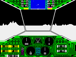 The mission is viewed from the cockpit of the Prowler aircraft, looking over a 3-D environment of mountains and sky. Complex instruments, including an altimeter, vertical velocity and ground speed indicators are at the pilot's disposal, plus full control over the craft's height, speed and direction.