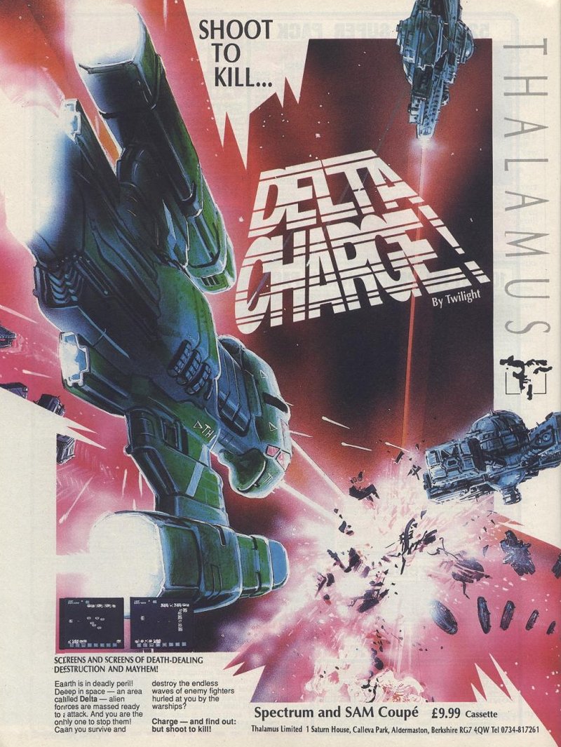 | Publisher: Genre: Author(s): Musician(s): Minimum Memory Required: Maximum Players: Joysticks: Language: Media Code: Media Type: Country of Release: Other Files: Comments: | ThalamusShoot 'em Up Twilight, Jason McGann, Andrew Swann, Peter Tattersall, Mark Mason Rob Hubbard 48K 1 - Eng N/A Audio cassette Europe Advertisement Released on ZX Spectrum as "Delta Charge!" and "Delta" on other platforms. | Sinclair ZX Spectrum |