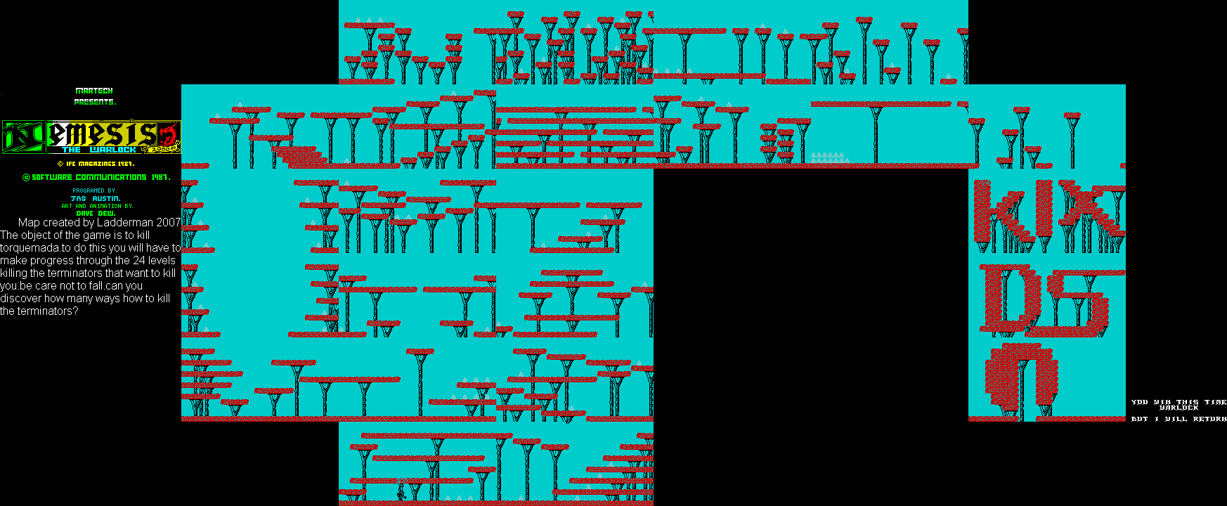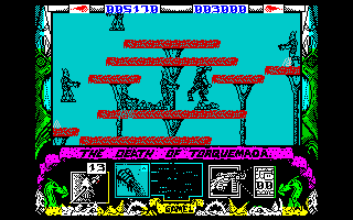 The game is a platformer, with the action taking place on the main screen. Underneath that are some smaller screens displaying complex goings on related to the game. One gives you the number of Terminators you have to kill to finish off a given level, another is the number of bullets in your gun - though bullets run out, and once they do it's back to hand to hand (well, sword, actually) fighting until you find some more. Then there are two other panels, one of which shows a mass of dots which eventually become the face of Torquemada, and the other shows Torquemada's hand gently squeezing your heart! Each time you're hit, the hand squeezes tighter. When it completes the action, you be dead, my boy, and off to heaven you do go!