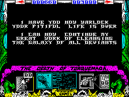 Issue 19 (July 1987) (Your Sinclair) 23rd Apr 2015 04:44Yet more superheroes! This time it's 2000AD's Nemesis The Warlock who's work you get to do. You have to kill Torquemada, the Grand Master of Termight. Sounds easy, doesn't it? The catch, as you might expect, is that Torquey baby has other ideas, so he sends out wave upon wave of demented Terminators to do you in. Each screen has a set number of Terminators to be terminated before your exit from the screen is possible.