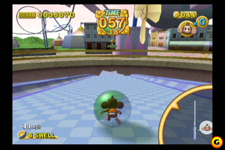 This was one of the most popular party games in Super Monkey Ball. It is a game similar to Pilot Wings. The point of the game is to get the most points by flying and then landing on the target underneath you. You get points depending on where you land on the target. You start out by rolling down a ramp collecting momentum. Then you pop up into the air. At the press of the A button, your ball folds out into two half spheres, which act as wing. If you open the ball too soon, you won't have enough momentum to reach the target, don't open at all, you will sink into the sea. Once you're flying, you can navigate using the control stick to gain bananas (if items is turned on) which will increase your points (1 banana = 1 point, a bunch of bananas = 10 points).