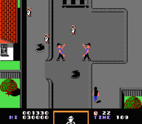 The running stages aren't too bad, but they are a little repetitive. I did like how it seemed like the game was gradually getting more difficult. The first running level was pretty easy, but by the end of the game I found myself being slightly challenged. There are also enough obstacles and things that you need to collect to make it interesting, albeit not that much fun. The music is also repetitive, since every time running level has the same music. Not that it's a bad song, but I don't need or even want to hear it over and over again. There is, however, a song in one of the "point" levels that comes directly from the movie and is quite enjoyable. Other than that part, you should put your headphones on and just ignore the in-game music. The graphics do what they're set out to do, and only that. Again, this is a game from 1989, so of course they're not as good as the games of today, but they work. I can tell what I'm supposed to pick up and what I'm supposed to avoid without and difficulty, so mission accomplished. I guess that you can call the graphics functional, if not anything else.
