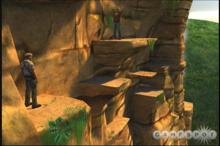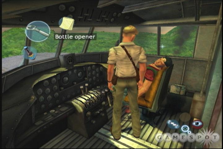 The answer, it seems, is by mostly removing all pointing and clicking. With the move to the third dimension, the developers have wisely chosen to grant you full direct control over your character (either George or Nico, depending on the scene) with the analogue stick. At first this may make The Sleeping Dragon seem like any other 3D action game, but as soon as you start to get to grips with the first scene of the game - in which George must attempt to escape the downed plane - you'll realise that this is not the case. Despite the move to full 3D, at heart the traditions and trappings of the old 2D Point-and-Click genre live on. It's a marvellous scene that sets the tone for the rest of the game perfectly: in order to escape the plane, which hangs perilously over the edge of a cliff in true Hollywood style, George must revive Harry, the Aussie pilot who was knocked unconscious in the crash. After some experimentation, it becomes apparent that the only way to do this is to find a bottle of beer and a bottle opener lying around in the plane - opening the bottle near Harry brings him back to his senses (what with him being Australian, and therefore a drunkard - well-meaning stereotypes abound in The Sleeping Dragon). The mechanics by which you solve this problem may have changed - George now explores and picks up items in a normal 3D way, rather than by way of a cursor and a list of options - but it's clear that the old-fashioned abstract puzzle-solving is still very much the order of the day. And that's a good thing.