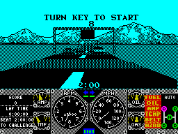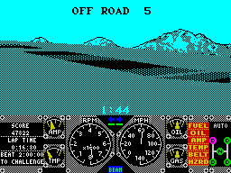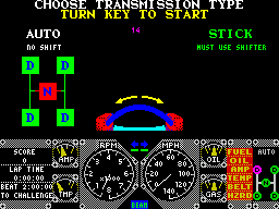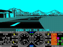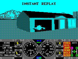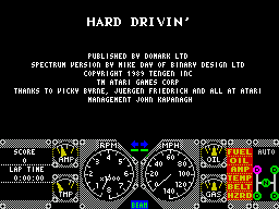 The original arcade version of Domark’s Formula 1 entry into the Chrimble scramble isn’t so much a racing game as a racing simulator: an impressive beast, mainly because of the clutch/gear set up that allows you to drive it like a real car. Obviously the Speccy isn’t built like a car, but you do have the option to pick either manual or automatic gear mode just by moving the steering wheel left or right to choose. Two tracks await you: Stunt and Speed. As the name suggests, the speed track demands warp speed driving. But the Stunt track is probably the most graphically impressive of the two, because apart from driving like a maniac you must negotiate three types of obstacle.