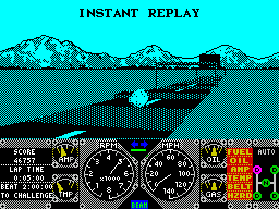 These are the Bridge Jump, the Loop the Loop and if your stomach is still in its proper place the Bend’s sheer slope has to be tackled. Watch out on both tracks for the speed signs: drive any faster or slower than they advise and you’ll be witness to the spectacular action replay of your car rocketing off the track and exploding in a sheet of flames. The first lap (whichever way you go) is against the clock, and if you beat the lap time you enter the second phase of the game.