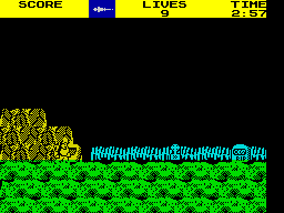 The knight is not totally defenceless. At the start of the game he is provided with a weapon. This can either be a lance, a sword or a magic fireball - all activated by a press of the fire button. Some weapons are more effective than others: the fire bombs are lobbed into the air and careful timing Is needed to dispose of nasties, while the fire button sends out a stream of daggers at gizzard height if the hero is equipped with the little knife. Points are collected for each nasty killed. Some of the Demon King's minions carry weapons, and when they are killed the knight's weapon changes automatically - care is needed if you are to avoid being lumbered with a weapon you don't want.