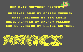 | Publisher: Genre: Author(s): Musician(s): Minimum Memory Required: Maximum Players: Joysticks: Language: Media Code: Media Type: Country of Release: Comments: | Bug-Byte Software LtdArcade Choice Software, Adrian Sherwin, Tim Lewis Andrew Peckham 64K 1 Yes (optional) Eng N/A Audio cassette UK (£6.95) | Click to choose platform: Commodore 64 Sinclair ZX Spectrum |