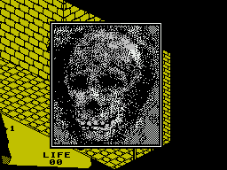 Isvar begins with a life force of 99 units, shown on a counter on the scroll. This counter is decremented by encounters with the trolls, guards and other nasties that patrol the castle and may be topped up by eating food or drinking wine that can be found here and there. Isvar can fight and kill some of the nasties, using his sword, but other opponents are not in the least perturbed by his efforts and are best avoided completely.