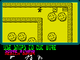 The game seemed pretty nice actually, a kind of gauntlet-y, commando-y type of thing. I visited the guys writing the game just once, in a very scruffy office in Bramhall I think. I was used to the rather plush Binary Design offices, in the big city, so I felt like I was slumming it a bit, hehe. The programmer's nickname was 'Slimbo', and I can distinctly recall the folds of his more-than-ample bottom drooping over the edges of the tall thin breakfast type stool he was sat on when I visited."