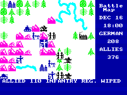 This one's based on the Battle of Antwerp which happened around the end of WWII. If you cast your mind back to Imagine's Stonkers, there are a lot of similarities - such as using the cursor to move troops around on-screen. Also like Stonkers, you're kept up to date by means of a ticker-tape display.