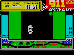 At the top of the screen the distance to the end of the stage is shown together with the total score and the time remaining to complete the stage. Your car appears to stand still while the road scrolls downwards, and since only a small part of the road ahead is in view you have very little warning of the oncoming hazards.