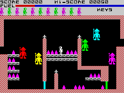 Each cave occupies the lower part of the screen with the upper area reserved for important information relating to status, lives remaining and score. There is usually an exit on at least one wall of each cave, and as you fly/walk through it another screen flips into view. Dodging the mindless nasties successfully comes with practice, but the homing baddies present more of a problem. They look like white stick men and zoom towards your location with a frightening fervour. You have eight lives to start with, and some quick learning is called for... Your man is unarmed, so the nasties have to be avoided rather than killed, and points are awarded for progress.