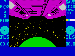 Lifeship Vega has achieved orbit around the planet Prolon in response to an emergency call from the planet's explorations team, who have left their ship and gone off in the hydrocrawler and then fallen foul of the crawler's power-plant and the craft now lies in the treacherous terrain of Braxx Bluff, its occupants dying as the life-support system fails. Your mission is to walk on foot to the crawler - if you can find it - and get it back to base-ship before the crew dies. The nearest possible site to the stranded crawler has been marked with an ILS beacon. The game starts with you sitting in your shuttle slung under the bulk of the Lifeship. From your viewscreen you can see the underside of the ship above you and Prolon below. A keypress undocks and you glide down to skim the planet's atmosphere, then dip in and the game is away. The display shows you the view from your cockpit with two small circles to either side with a dot in each of them. Below the circles is the score. The circles are your ILS beacon and the object is to keep the dot in the very centre. The more it stays there the higher your score gets. To land on the runway you must score at least 8.0 points. As you dive down to the ground (judge by the altimeter) the 3D effect becomes stronger as the surface of the planet rushes up towards you. Don't forget to fire retro rockets on touch down!
