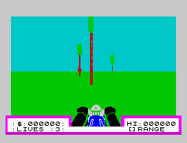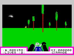 3D Deathchase on the SpectrumTwo more kills and you would be onto the next stage, which would be a denser forest with more trees to avoid. Crashing into a tree meant instant death and the loss of a life.