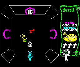 This was more or less the game that the term 'arcade adventure' was coined for and one that spent months at the top of the charts of every games magazine. It is set in a castle of 200 rooms and hidden somewhere in those chambers are the three parts of a key needed to escape. You can take the role of a knight, a wizard or a serf in your quest, each having different weapons and being able to use different secret passages. After a few seconds in each room, it fills with a variety of different baddies who are out to suck you of your life energy. Despite the clumsy controls, Atic Atac is a genre-defining game, and one whose very name evokes memories of the Spectrum era.