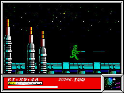 Dan is a superfit fellow, capable of moving left and right, up and down, and he can jump over chasms and duck to avoid Treen laser bolts. To help him in his quest, a variety of objects lying around can be collected by jumping onto them, including bullets to boost his arsenal and pills to increase his energy.