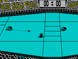 The players take it in turn to attempt to hit the puck. At the start of the game, a 'time out' is set and this time - from one to nine seconds - is the time a player has to set up a shot. When it's your turn, you position a cursor on the pitch. An 'elastic' line stretches between the skimmer and the cursor ... useful, because the screen always displays the segment of pitch containing the puck, so if your skimmer is some distance away, it occupies another segment and doesn't appear on screen. Then, either when the time out ends, or when fire is pressed, the skimmer speeds towards the cursor. Then it's the other player's chance to have a go. Obviously, with longer time out times, both players can position the cursor meticulously, and have time to work out all the angles. With quick time outs, it becomes a fast and furious game. The idea is, predictably, to hit the puck through the opposing goal. When you do, the crowd roars, the electronic scoreboards around the stadium flash, and it's back to the centre for a kick off. The game is divided up into four quarters which can last from one to nine minutes each. At the beginning of each quarter and after every goal, the puck is kicked off again from the centre. The pitch is shaped like a squared off oval, with goals placed at either end and the trick in the game is to try to keep the puck between you and your opponent's goal. Once it gets behind you, unless you can work out some fancy angles, it's best just to zip down to your own goal area.