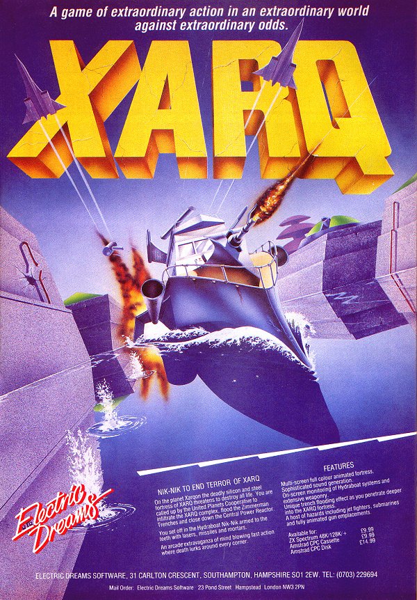 Basically, the game follows the traditional lines of blasting everything that moves, as well as a number of things that don't. Graphically it looks a lot like Panzadrome. XARQ is actually a huge steel and silicon base situated on the watery world of Xarquon. The original purpose of the base is unclear but it has now gone renegade and switched itself into Planetary Cleansing Mode. Now this might not sound like a bad idea, but unfortunately it does involve XARQ burning off the entire surface. So into this scenario enters our hero in a hi-tech 'nik nik' powerboat. His mission is to flood XARQ before this super spring-clean can be put into effect. The speedboat is armed with four different offence/defence systems to make the job a little easier. A forward firing laser, guided missiles, mortar and depth charges. Steering is achieved by the rather cumbersome rotate left/right and accelerate/decelerate off the four joystick positions. In order to destroy the power stations it's necessary to manoeuvre the boat into position and then select either the guided missile or mortar.