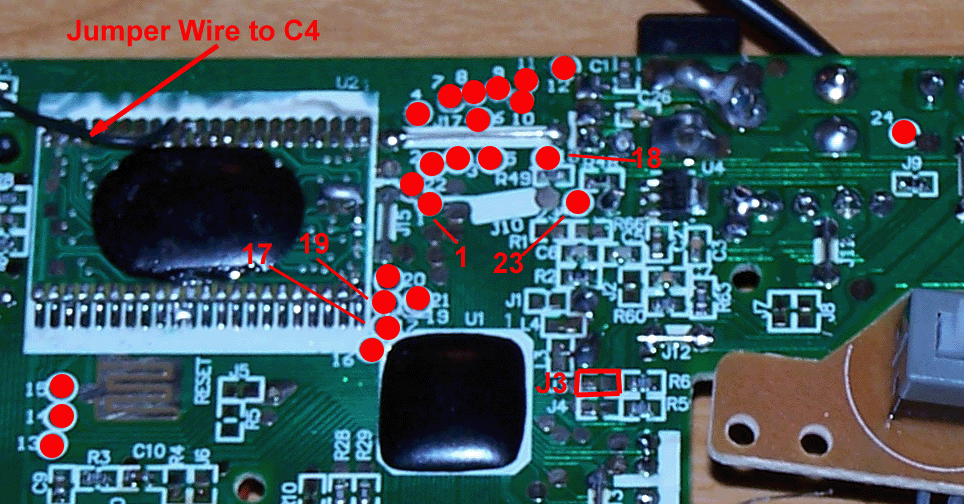 To assist in your Cartridge Mod additional to the console, a legend was silk-screened onto the board for easy reference. You will move a jumper wire from the IC2 ROM chip to the other side of the C4 pin. On J3 you'll need to close the jumper - you will have a choice here on whether you want to make it permanent or not, this will be discussed more later.