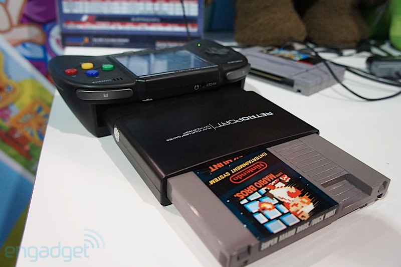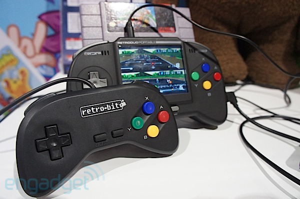 Inspired, perhaps, by the fruits of Ben Heck's dual-console handheld dreams, Retrobit has retrofit their Retroduo NES / SNES hybrid game console to fit in your hand. The Retroduo Portable, a handheld SNES console shown for the first time at CES 2012, hopes to one-up Hyperkin's SupaBoy by adding support for classic NES games. We dropped by their booth to get a closer look.